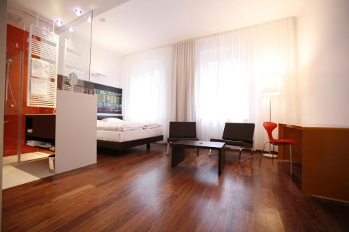The Arte Hotel Linz's rooms were individually conceived by local designers and artists, and feature dark wooden floors, a minibar and free high-quality toiletries.