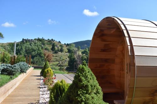 This room has a panoramic mountain view, bathrobes and a coffee machine.
