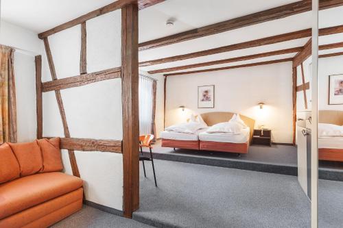 Furnished in classic style in a half-timbered house, this room comes with a double bed, sofa bed, minibar, flat-screen cable TV, a telephone, safe and free WiFi. The bathroom includes a bath or shower, hairdryer and a cosmetic mirror. Please note that the room is located in a half-timbered house dating back to 1552 and is not accessible via lift.